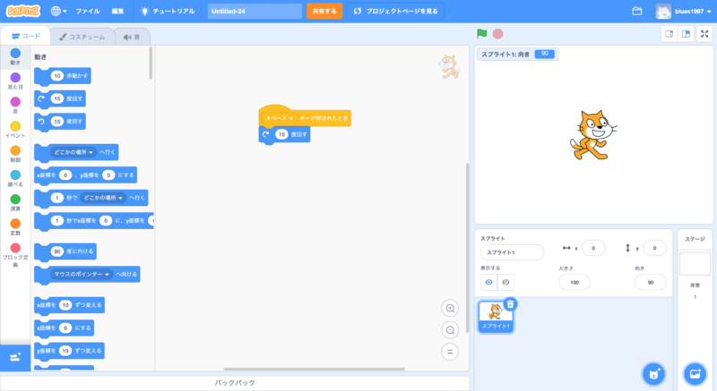 「スプライトの向き」の表示と、画面上のスプライトの向きが変わることを確認してください。