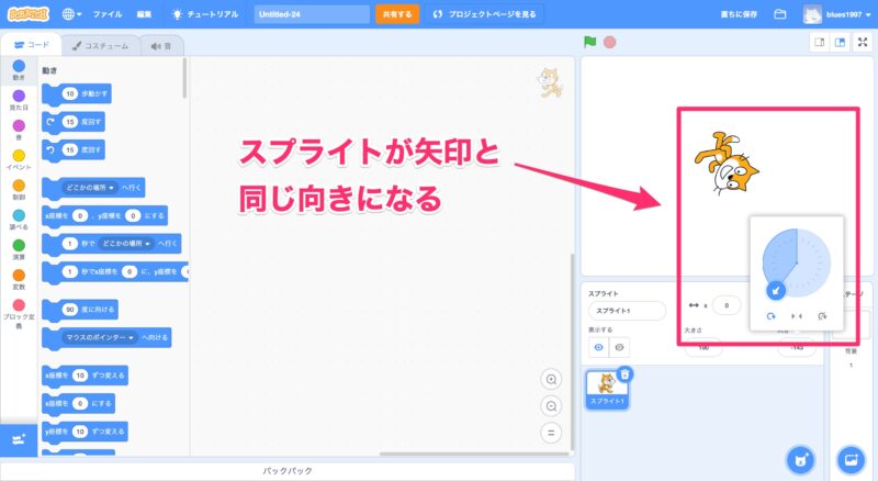 矢印をドラッグ&ドロップするか、数字を自分で入力することでスプライトの向きを変えることができます。