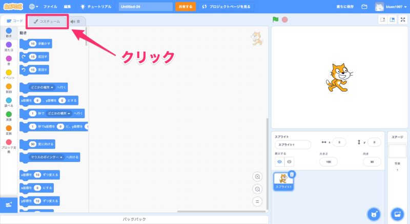 プロジェクトを開いて、「コスチューム」をクリックしてください。
