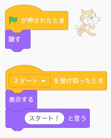 スプライトキャットのプログラムは「スタート!と言う」以外同じなので自分で作成してみましょう!