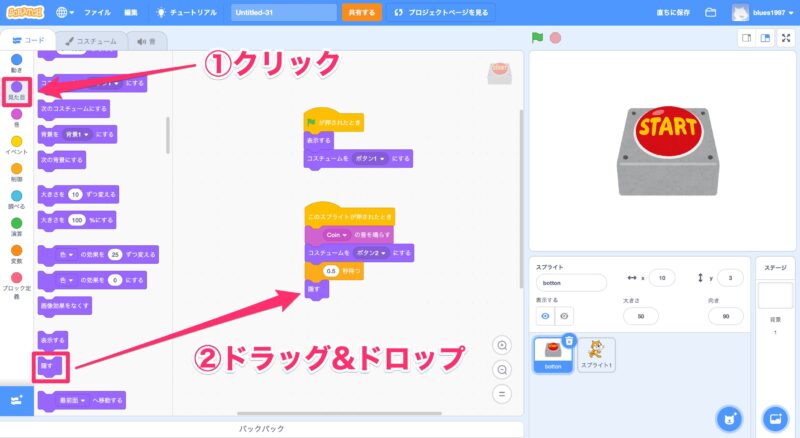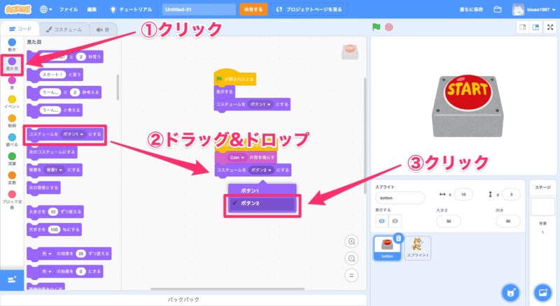 「見た目」をクリックして、「コスチュームをボタン1にする」をドラッグ&ドロップしてください。