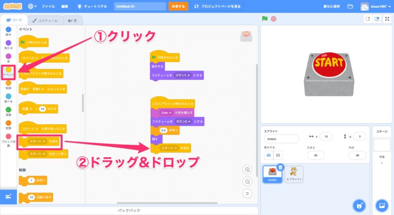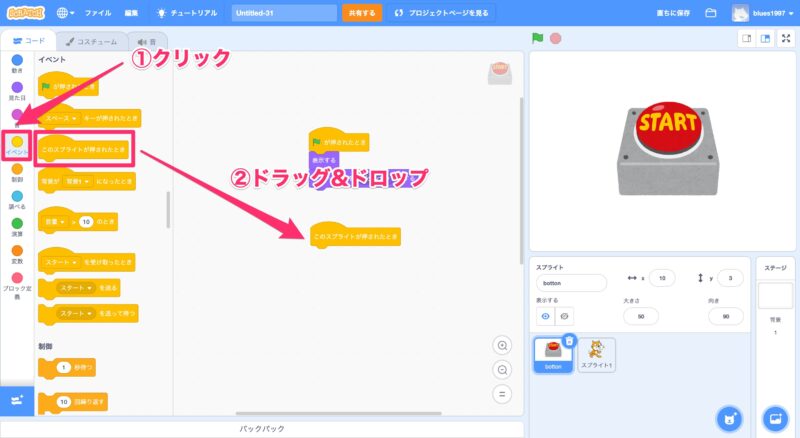 「イベント」をクリックして、「このスプライトが押されたとき」をドラッグ&ドロップしてください。