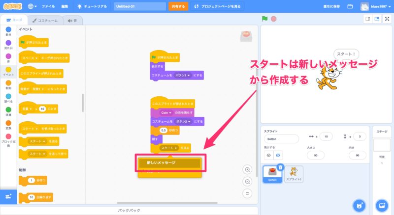 ここからは実際にスタートボタンのプログラムを作成していきます。