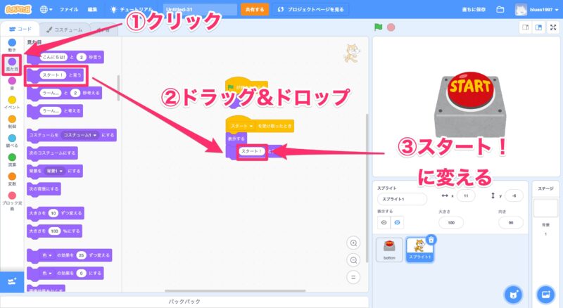 「〜と言う」を「スタート!と言う」に変えれば完了です!
