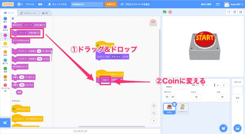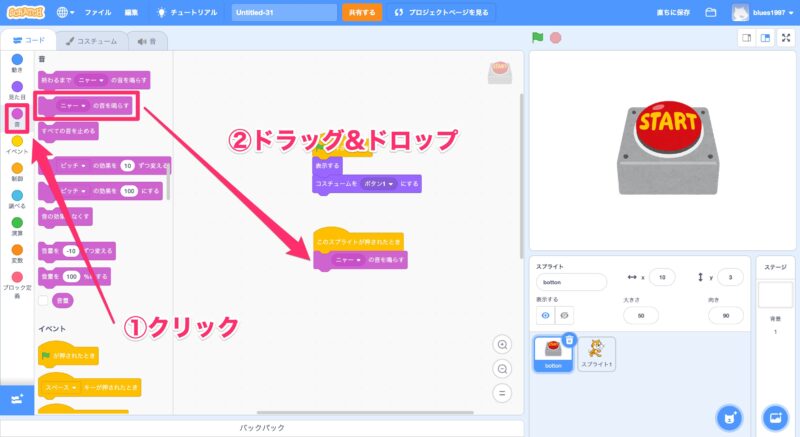 続いて、「コスチュームをボタン1(ボタンを押す前のやつ)にする」をドラッグ&ドロップしてください。