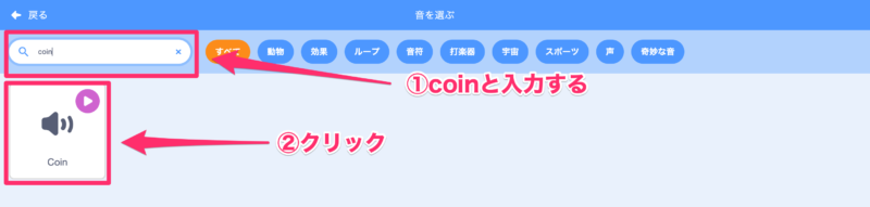 「音」、「音を選ぶ」を順にクリックして、入力に「coin」と入れてください。