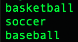 sportsという変数のリストには、basketball, soccer, baseballが入っています。
