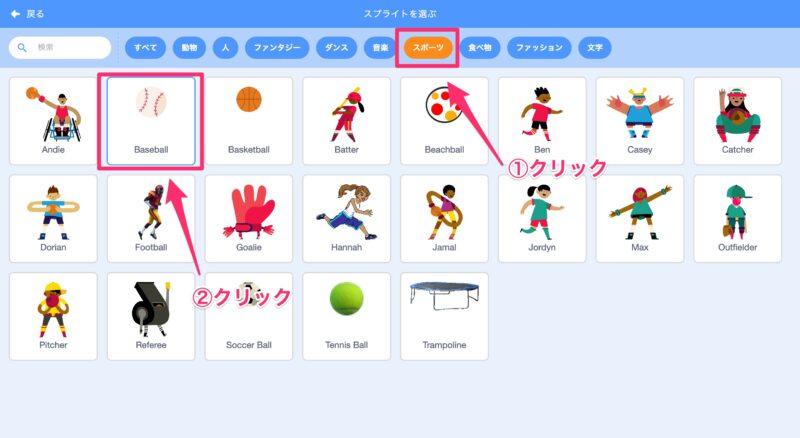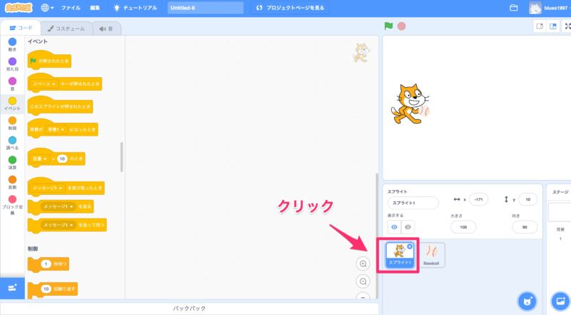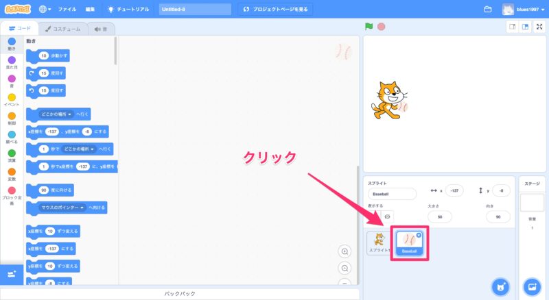 「Baseball」のスプライトに対してプログラミングを行なっていきます。