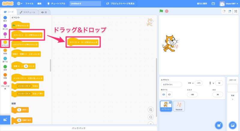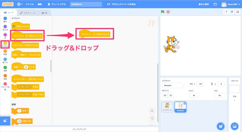 次に、「イベント」をクリックして、「スペースキーが押されたとき」をドラッグ&ドロップしてください。