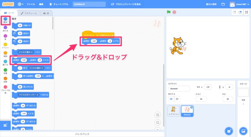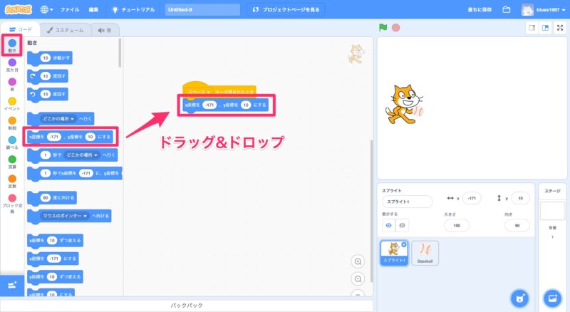 次に、「動き」をクリックして、「x座標を〜、y座標を〜にする」をドラッグ&ドロップしてください。