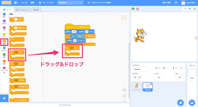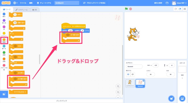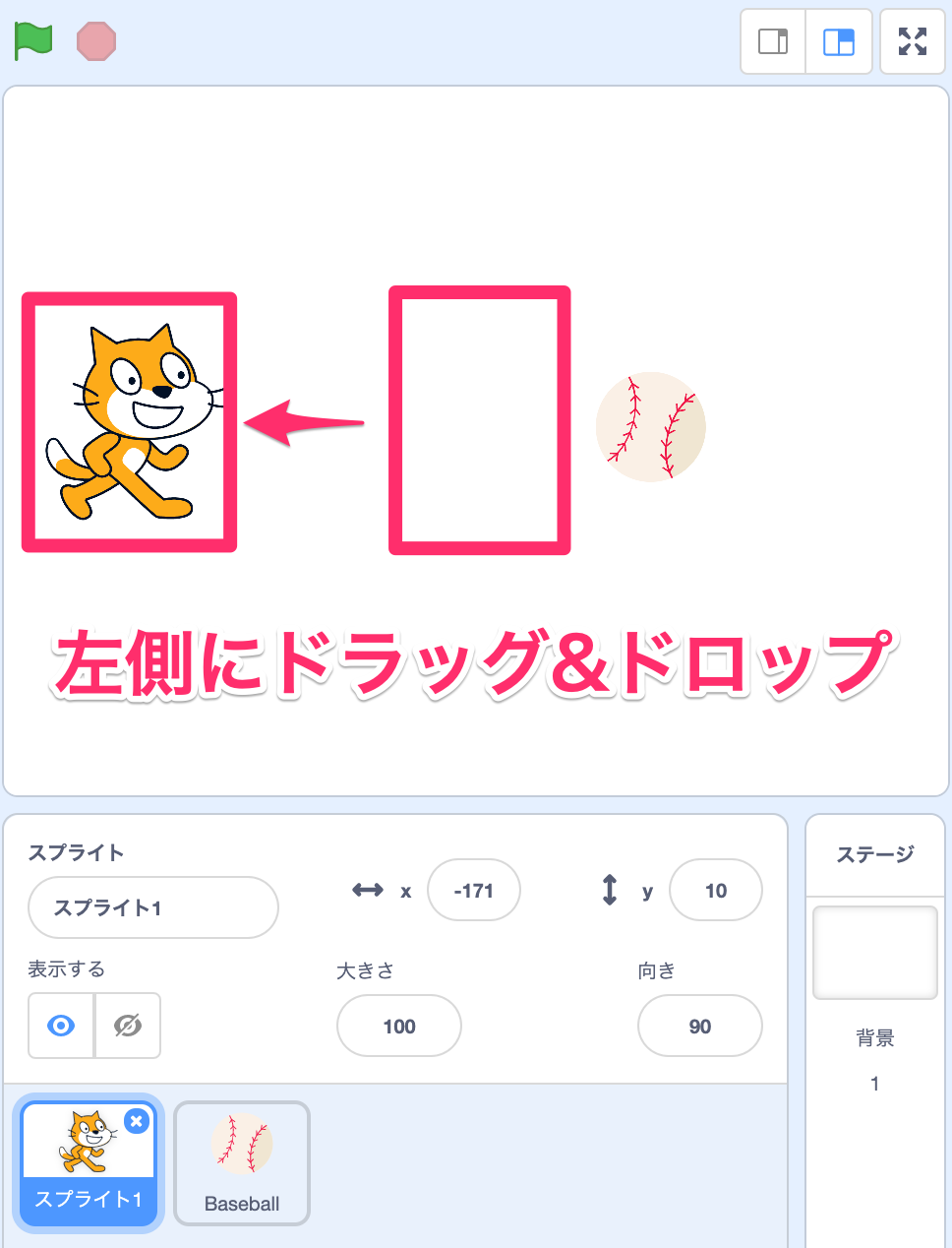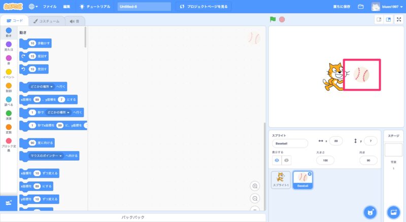 次に、「Baseball」をスプライトキャットの手元に移動させてください。