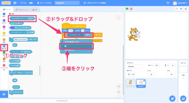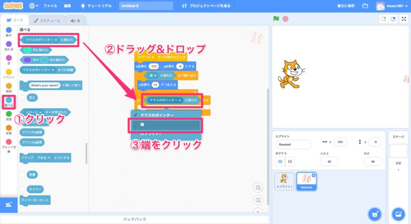 次に、「調べる」をクリックして、「マウスのポインターに触れた」を「もし〜なら」のなかにドラッグ&ドロップしてください。