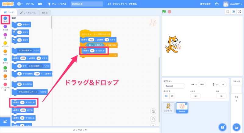 最後に、「動き」をクリックして、「x座標を10ずつ変える」をドラッグ&ドロップしてください。