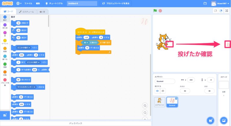 これでスクラッチキャットが野球ボールを投げるプログラミングが完了しました。