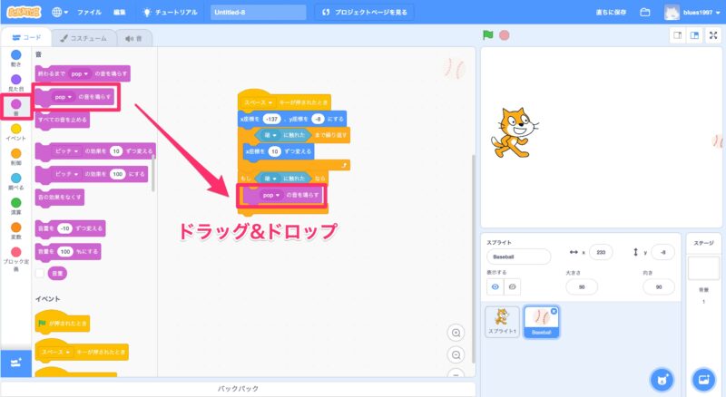 最後に、「音」をクリックして、「popの音を鳴らす」をドラッグ&ドロップしてください。