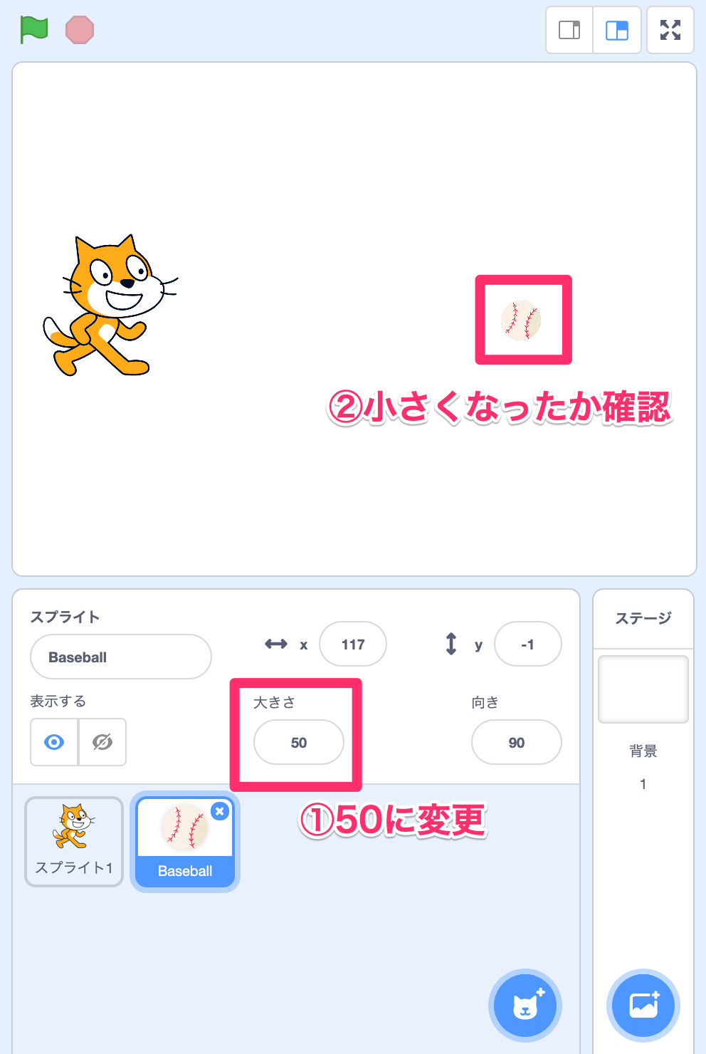 「Baseball」の大きさを100から50に変更しましょう。「Baseball」が小さくなったか確認してください。