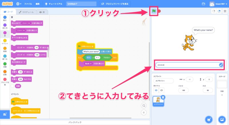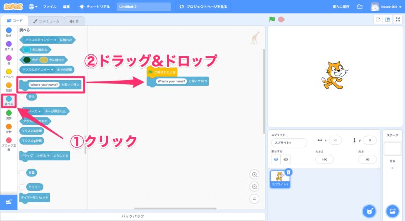 「調べる」をクリックして、「What's your name?(あなたのなまえは?)と聞いて待つ」をドラッグ&ドロップしてください。