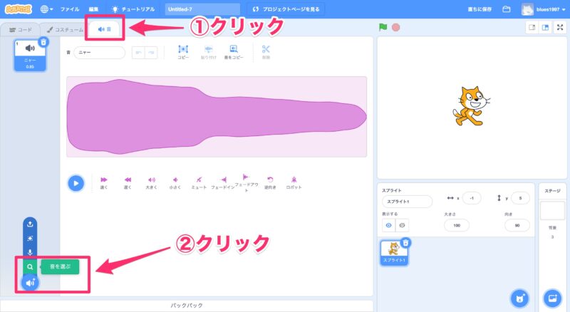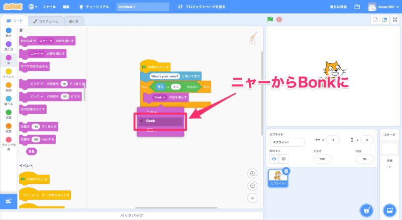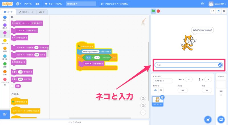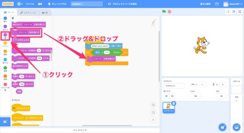 「音」をクリックして、「ニャーの音を鳴らす」をドラッグ&ドロップしてください。