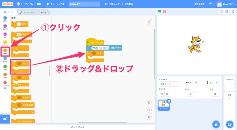 「制御」をクリックして、「もし〜なら」をドラッグ&ドロップしてください。