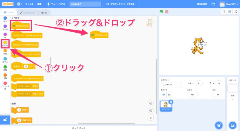 「イベント」をクリックして、「実行(緑の旗)が押されたとき」をドラッグ&ドロップしてください。