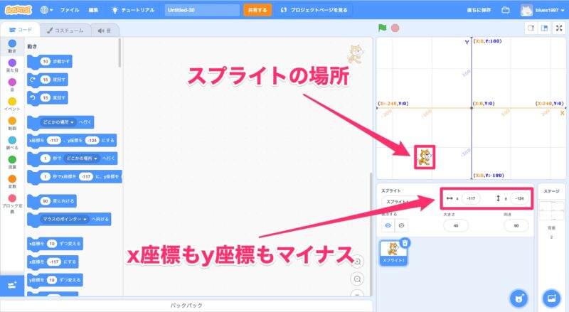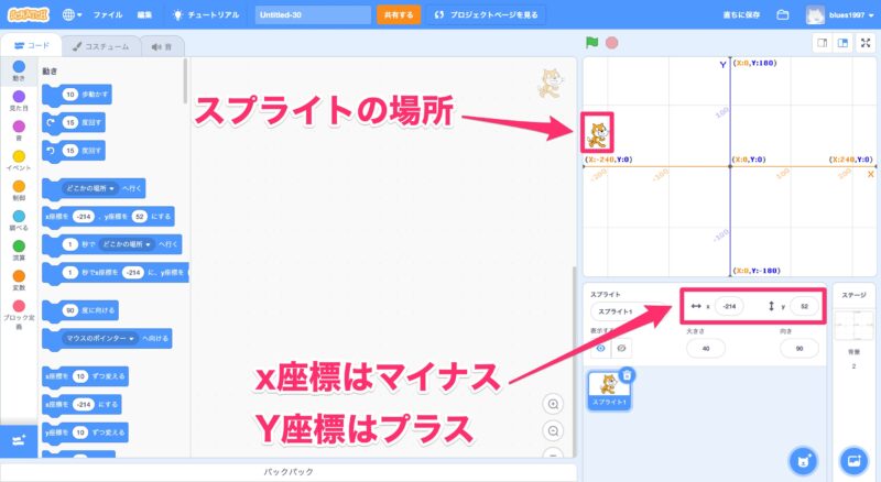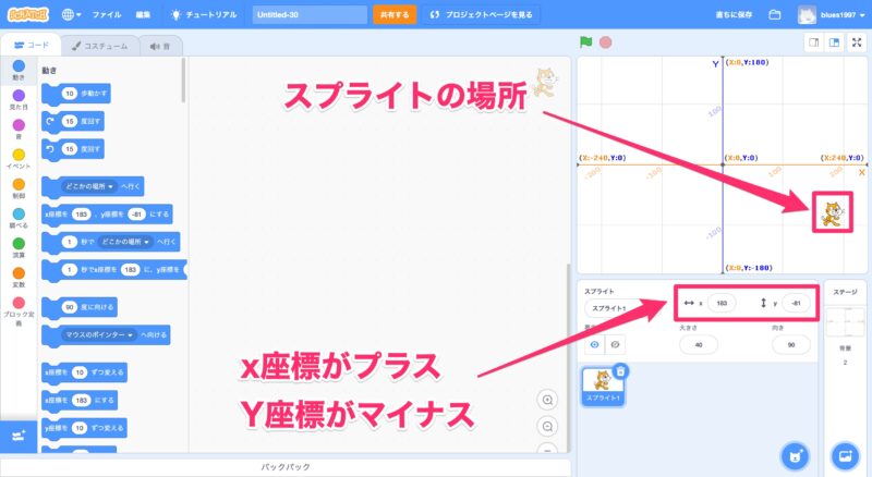 スプライトを動かしてみて実際に座標を確認していきましょう。