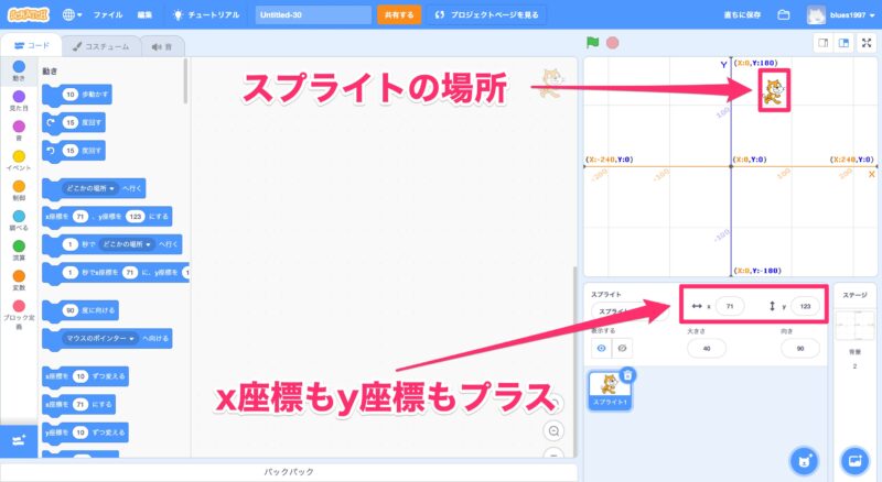 x座標もy座標もプラスの場合は、スプライトの場所は右上になります。