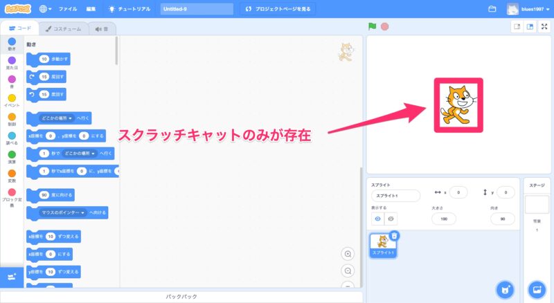 Scratch(スクラッチ)では、「作る」をクリックすると「スクラッチキャット」のみが存在する画面に移動します。
