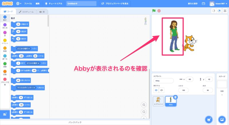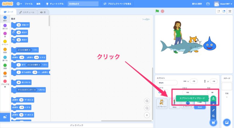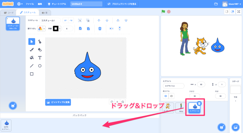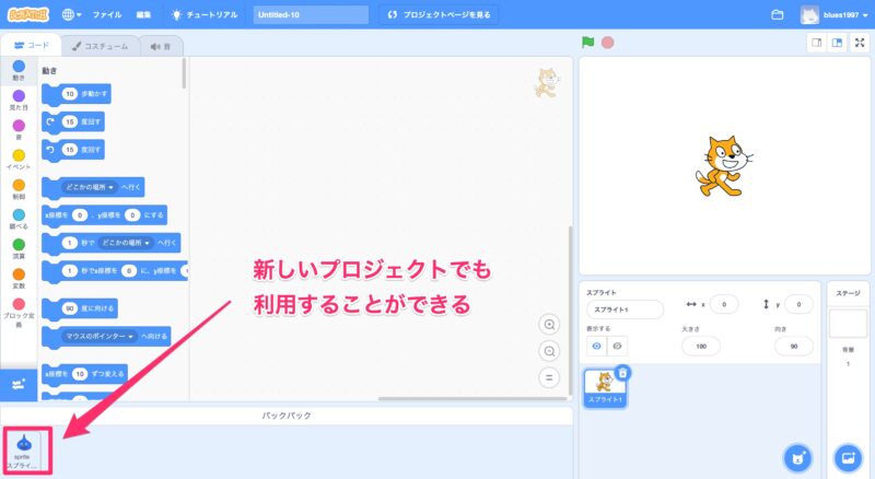 自分で作成したスプライトはバックパックに保存することでどのプロジェクトでも利用することができるようになります。