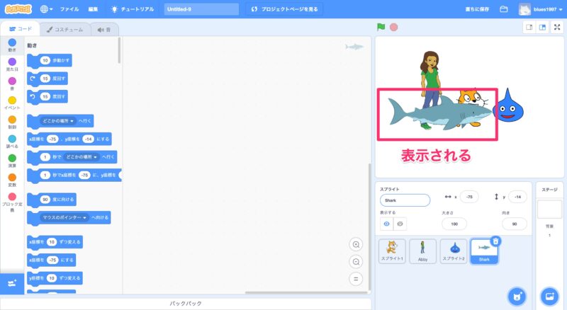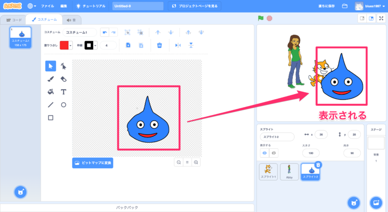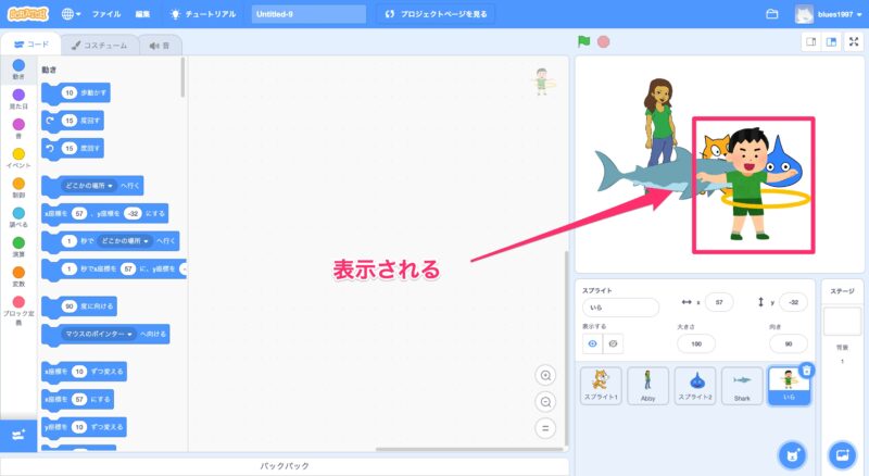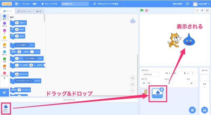 ドラッグ&ドロップすると追加したスプライトが表示されます。