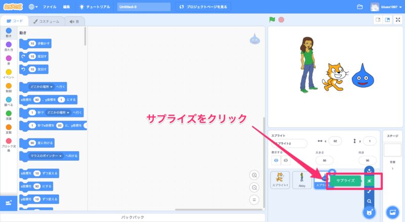 サプライズはスプライトをランダムに選んで追加してくれる機能です。