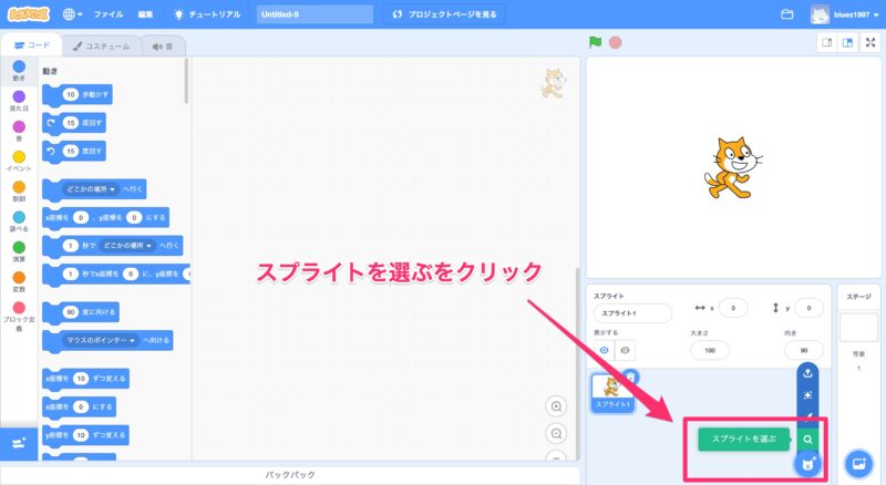 右下の動物の絵のマークにカーソルを合わせて「スプライトを選ぶ」をクリックしてください。