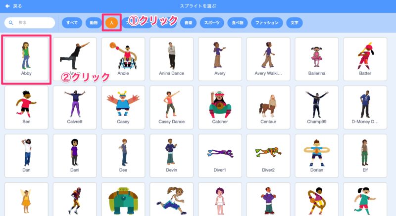 試しに「人」をクリックして、左上の「Abby」をクリックしてください。
