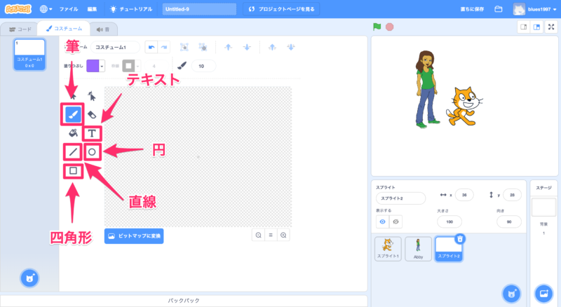 スプライトは基本的に「筆」「テキスト」「円」「直線」「四角形」を使って描いていきます。