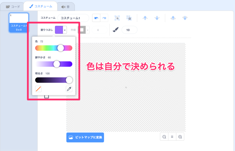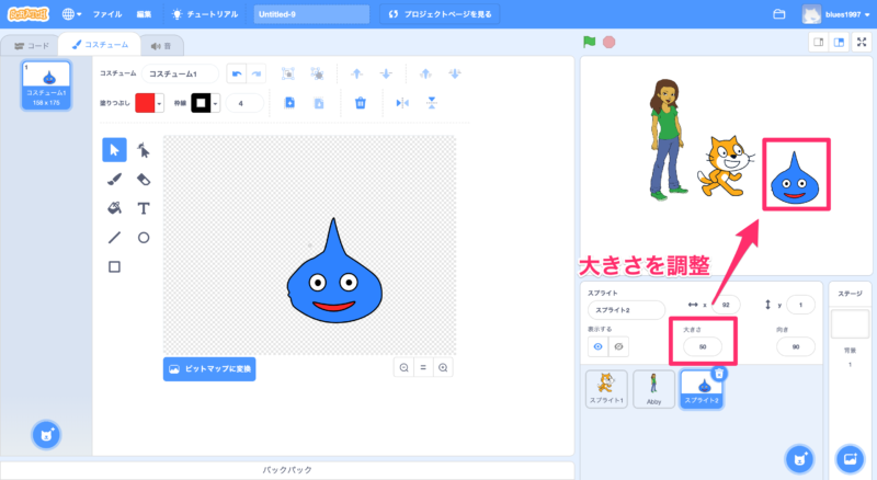 作ったスプライトが大きすぎたり小さすぎたりした時は、大きさの値を適当に変えて調整してみてください。