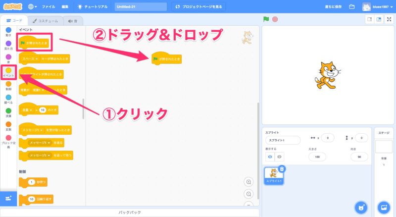 「イベント」をクリックして、「実行(緑の旗)が押されたとき」をドラッグ&ドロップしてください。