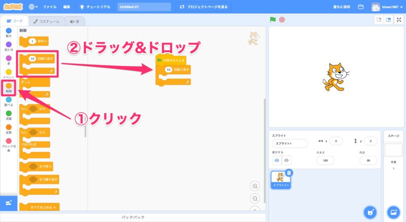 「制御」をクリックして、「10回繰り返す」をドラッグ&ドロップしてください。