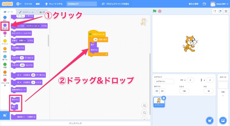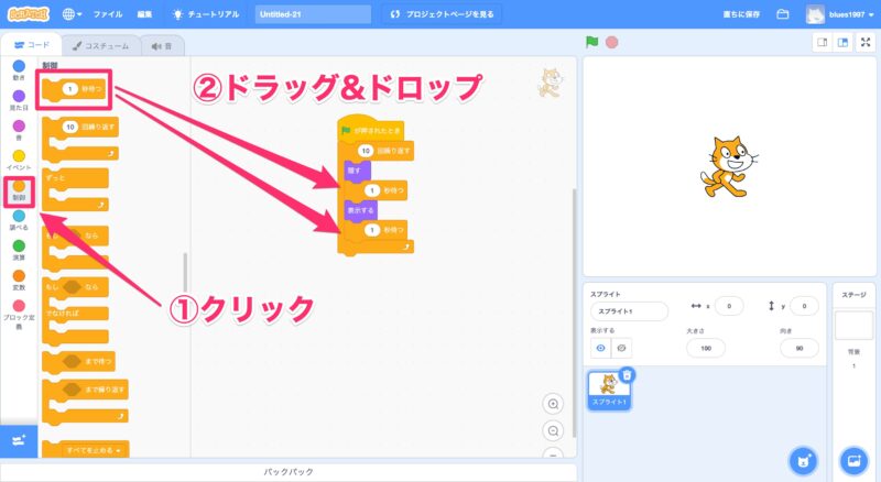 「制御」をクリックして、「1秒待つ」を2回ドラッグ&ドロップしてください。