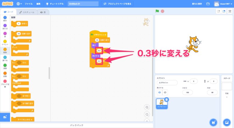 1秒を0.3秒に変えたのはスプライトの点滅のリアリティを出すためです(笑)