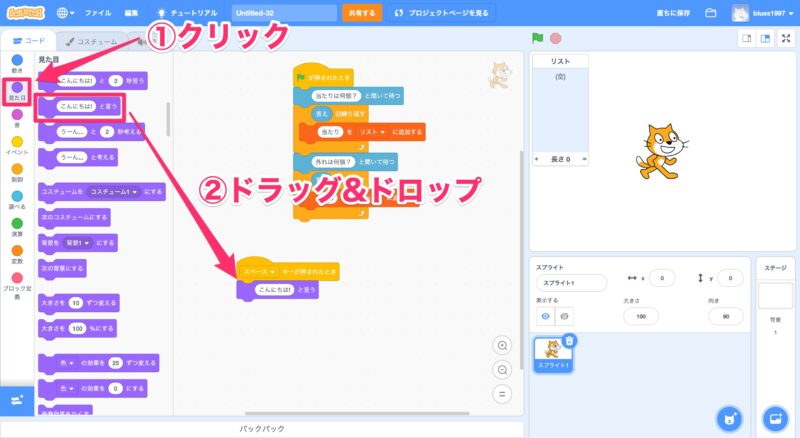 「見た目」をクリックして、「こんにちは!と言う」をドラッグ&ドロップしてください。