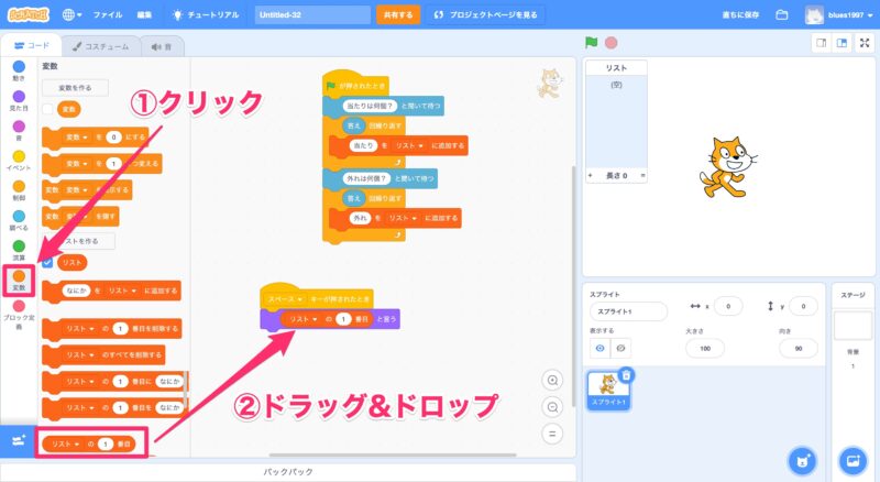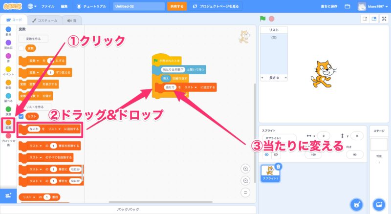 「変数」をクリックして、「なにかをリストに追加する」をドラッグ&ドロップしてください。