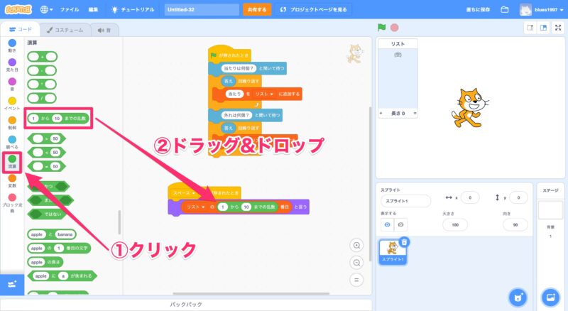「演算」をクリックして、「1から10までの乱数」をドラッグ&ドロップしてください。