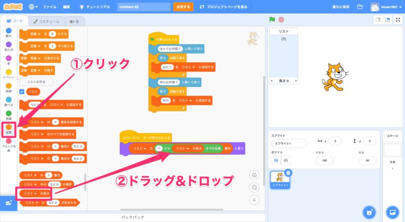 「変数」をクリックして、「リストの長さ」をドラッグ&ドロップしてください。