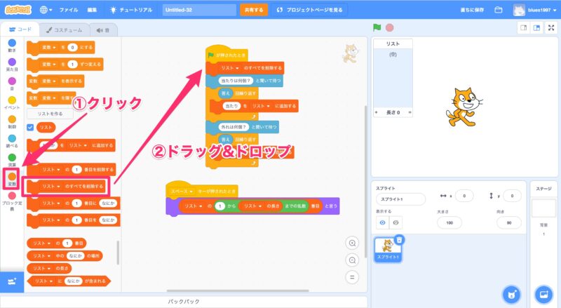 「変数」をクリックして、「リストを削除する」をドラッグ&ドロップしてください。