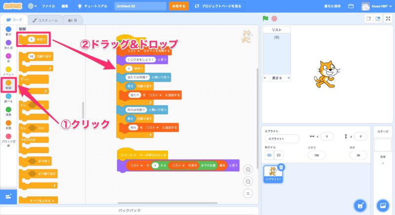 「制御」をクリックして、「1秒待つ」をドラッグ&ドロップしてください。