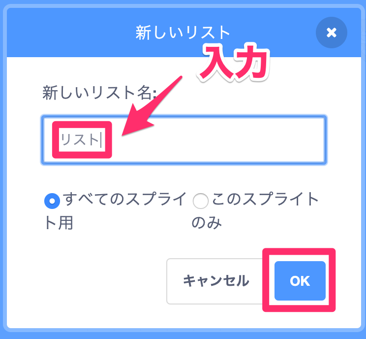 リスト名を入力してください。今回のくじ引きゲームでは「リスト」と言う名前に設定しています。