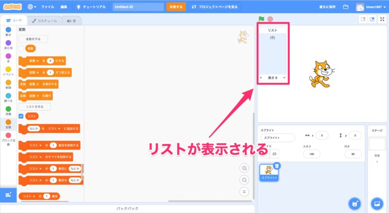 「変数」をクリックして、「リストを作る」をクリックしてください。