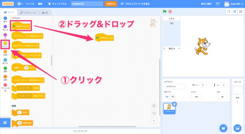 「イベント」をクリックして、「実行(緑の旗)が押されたとき」をドラッグ&ドロップしてください。