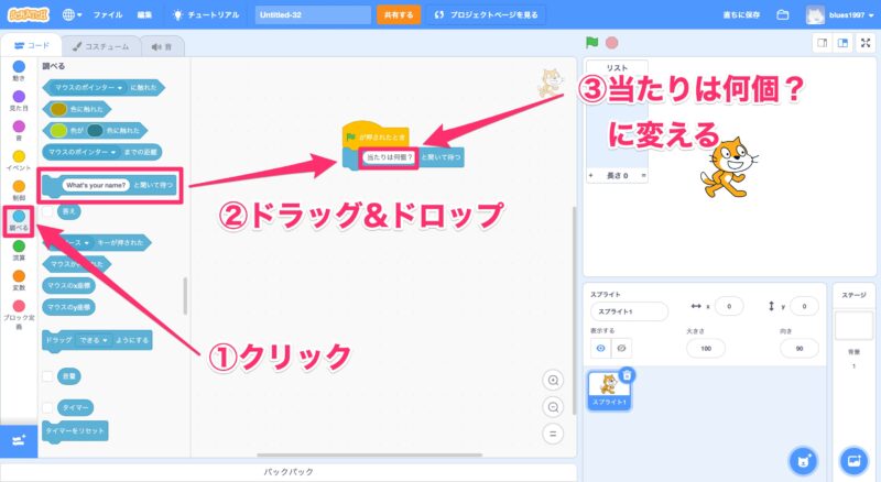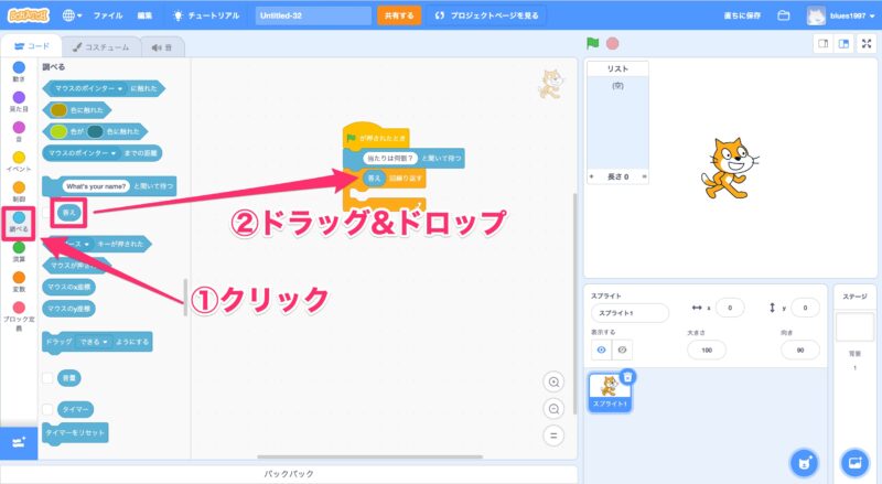 「調べる」をクリックして、「What's your name?と聞いて待つ」をドラッグ&ドロップしてください。