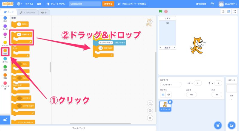 「制御」をクリックして、「10回繰り返す」をドラッグ&ドロップしてください。