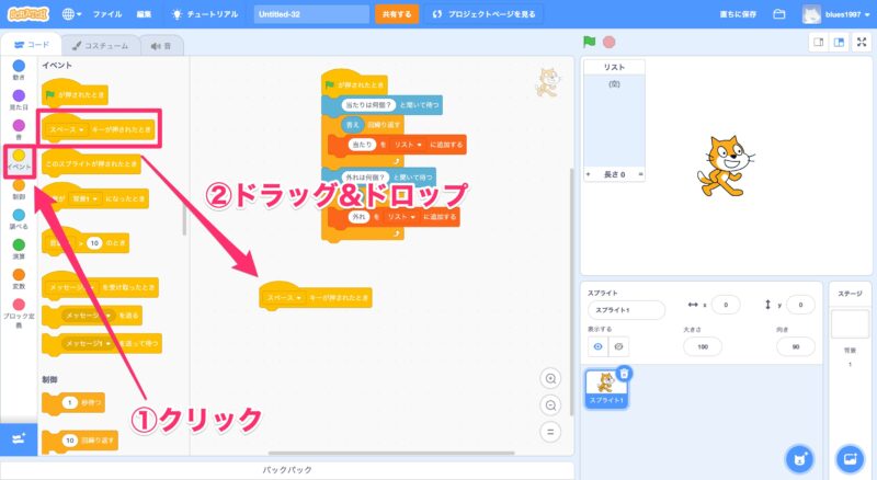 「イベント」をクリックして、「スペースキーが押されたとき」をドラッグ&ドロップしてください。